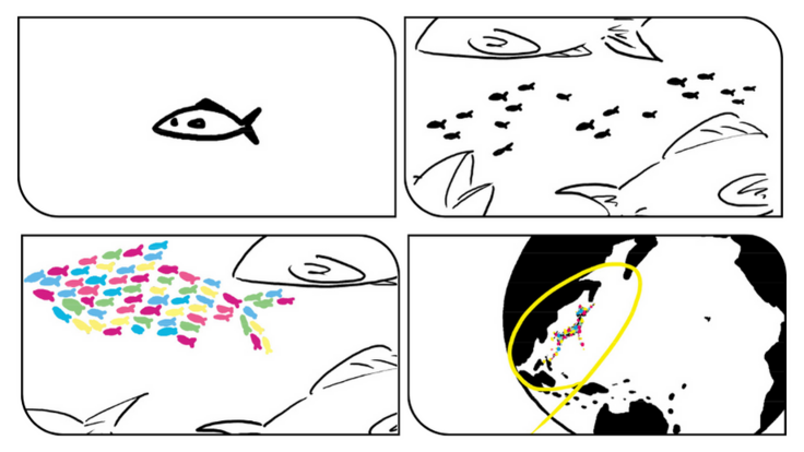 そこで、それぞれの島が共有できる目標やアイデアをもって連携することができれば、大きな魚として地球上に存在できる。そんなイメージです(ちなみに、スイミーの物語では赤い大魚ができますが、島はそれぞれ個性豊かなのでカラフルな大魚ができるイメージです)。