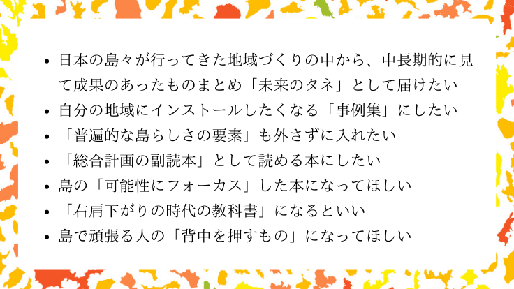 『島の未来計画(仮)』は、島の「課題」を「可能性」に変換し、島の未来を展望する書籍です。