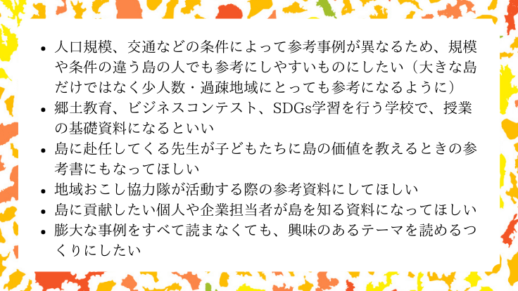 そこで必要と考えたのが、「島」という境遇で生きる島同士や、島を支えたい人、未来の島を支える人が、島の特性や好例を知り、互いのアイデアやヒントを共有することです。