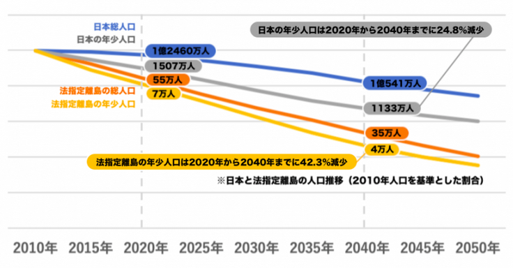 この数字は1年前には58,6万人でした。わずか1年で1万人減少し、未来を担う子どもたちの数も2010年の約9万人が2015年には約8万人に減少(※2)。今、日本の島では人口減少が想像以上のスピードで進んでいます。