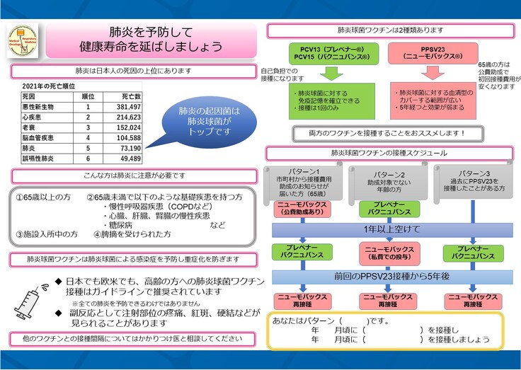 当科では肺炎球菌ワクチンのパンフレットを作成して、必要な患者さんにお渡ししています。