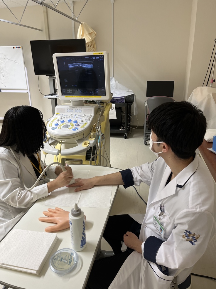 当科では、医学科5・6年生を対象とした臨床実習を行っており、その中で関節エコーへの理解を深める取り組みも継続しています。毎週水曜日には、本田医師の指導のもと、5年生向けの関節エコー実習を実施しています。