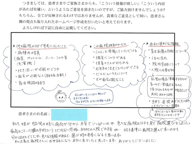 入院中のお子さんのベッドサイドで記載して頂き、退院前に事務員さんにお渡し頂く形にしていたので、なかなか書けなかった方々もおられましたが、色々とアンケートに記載して頂いて、我々が大変参考になった1つをご紹介したいと思います(添付の画像をご覧ください)。
