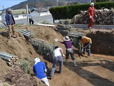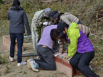 ▼そこへ、これまで作り上げてきた竹の束を設置していきます。