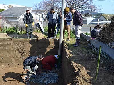 ▼まずは、雨が降った時に溜まる水をくみ出すためのパイプを埋めます。