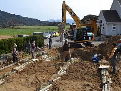 ▼深さ2mの穴にできるだけ美しく埋設していきます。