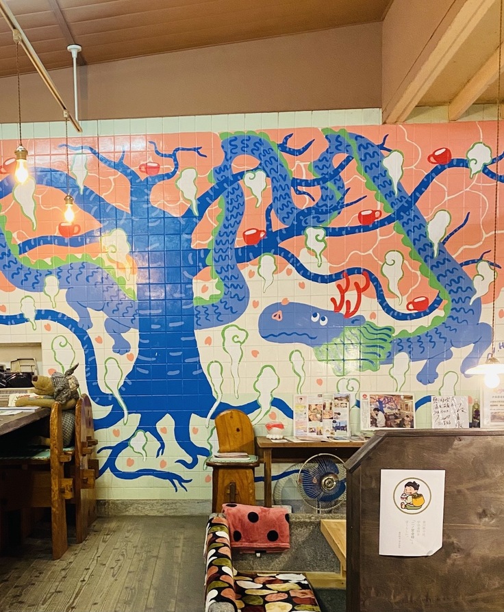 古き良き町の銭湯の姿を復活させた店内は、アートカフェという名の通り、壁画をはじめとする画家ヒダカナオトの作品と融合した空間になっています。地元の方々をはじめ、県内外からもお越し頂いております。