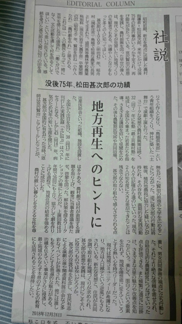 12月24日(月)の山形新聞・社説にて、没後75年にあたる本年、この度の演劇公演や関連資料の展示会の開催や、甚次郎の功績が紹介されています。