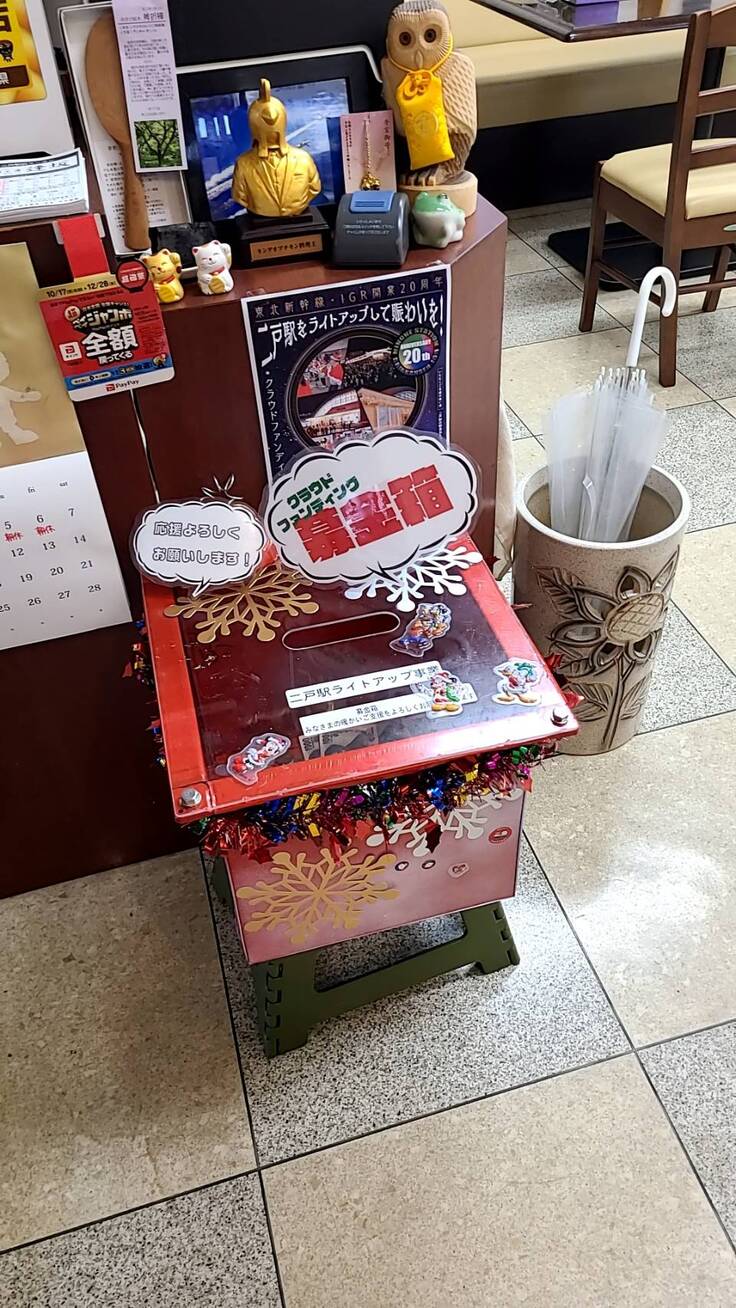 店舗では二戸駅ライトアップクラファンの募金箱を26日まで設置しております。朝ラーメンも食べられます!(6:30~営業中)定休日は月曜日となっております。詳しくは0195-23-7788まで!