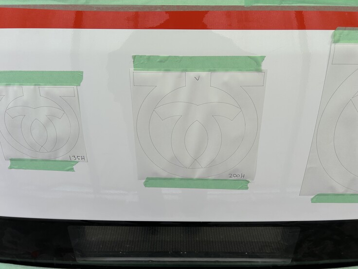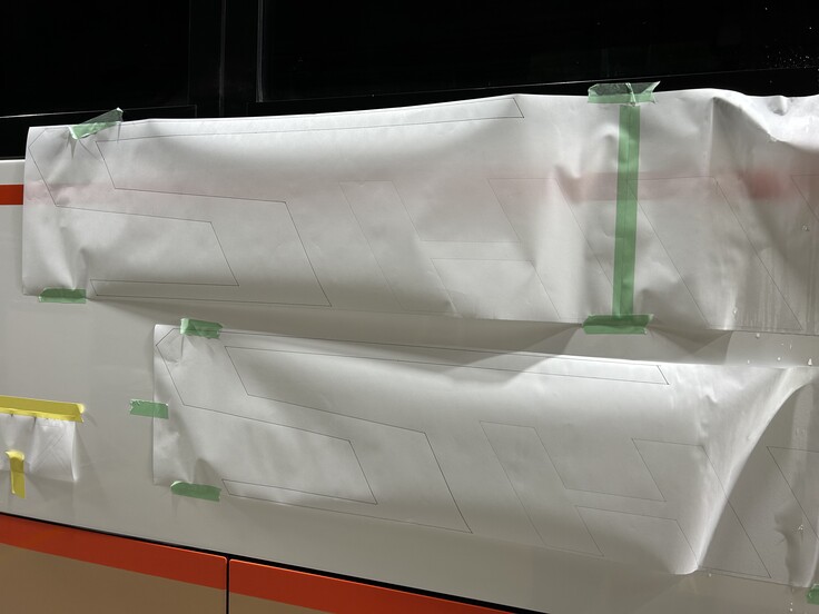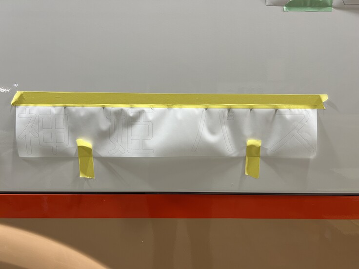 当時の図面通りの大きさで作るべきか、今の車体に合わせて少し大きさを変えるべきか、などをサンプルを車体に貼り付けながら話し合いました。