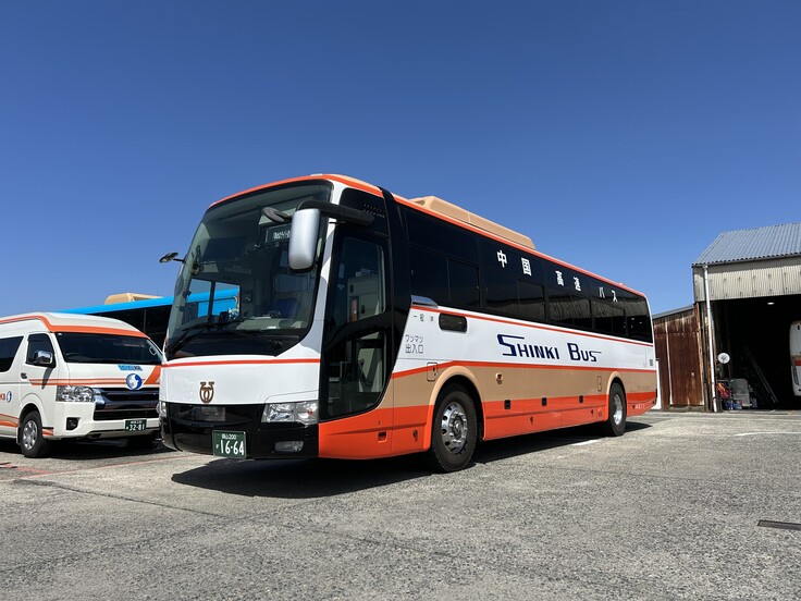 側面を見ると、赤・オレンジ・白の3色ベースは今と同じですが、「SHINKI BUS」のロゴが現行デザインと大きく異なります。また、当時の車両には窓の上部に「中国高速バス」の文字が入っていました。