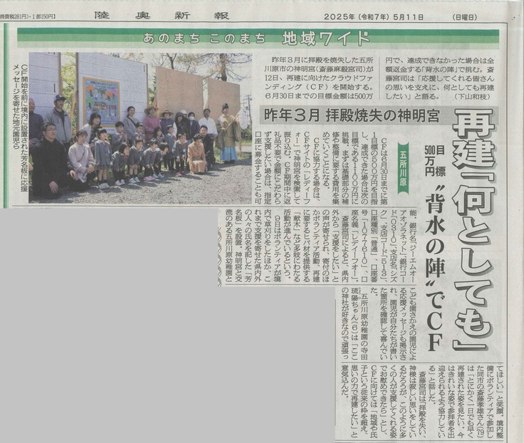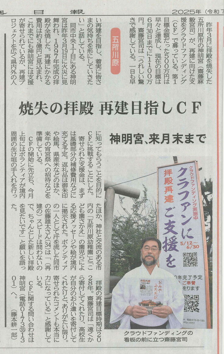 東奥日報には、5月24日付で第一目標500万円到達の記事が掲載されました。