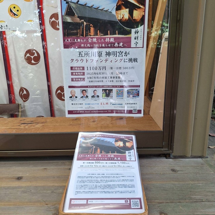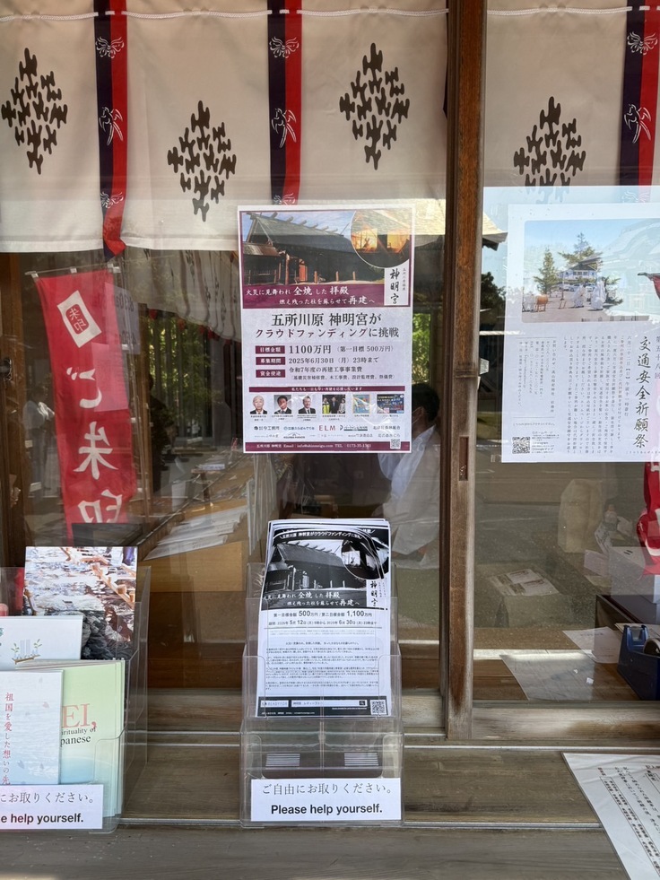 各神社の宮司さん格別のご高配により、ご社頭に当社クラウドファンディングのポスター、チラシを配置していただきました。