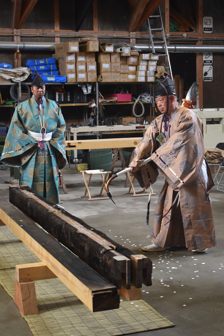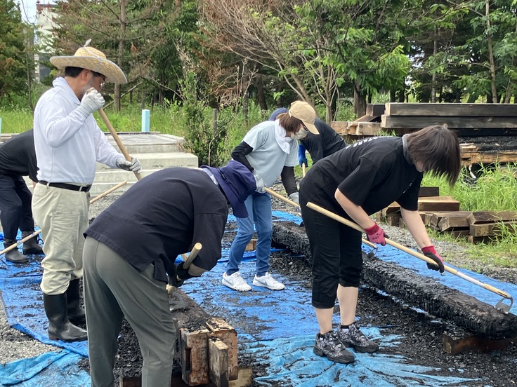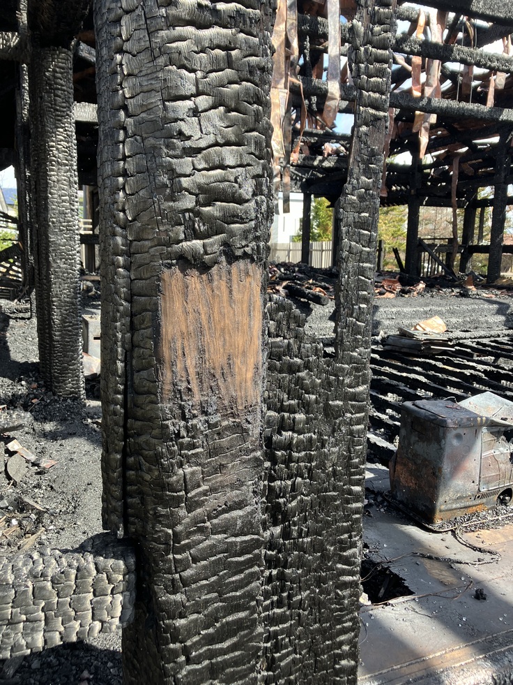 用材は、燃え残った柱などのヒバ材を使用いたしました。