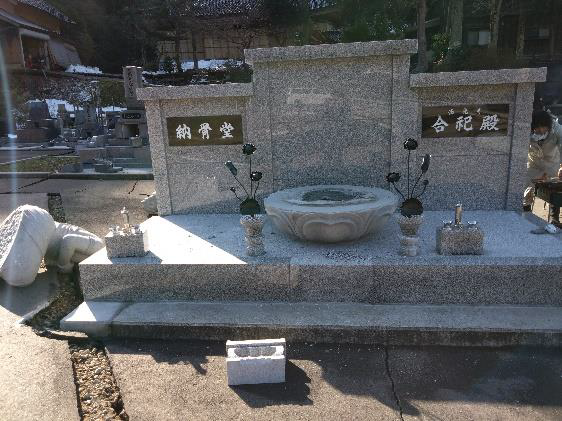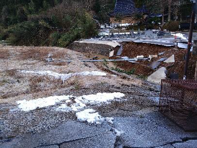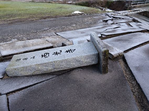 墓地・境内は、ほとんどのお墓が倒れ、お寺の前にある墓地しか確認が出来ていない状況となっています。山の墓地には土砂崩れと倒木で行けておらず、境内の至る所で地割れがあり、お寺に入る西光寺橋の両側に1mを超える段差ができてしまっており、車両の通行が出来ない状態です。