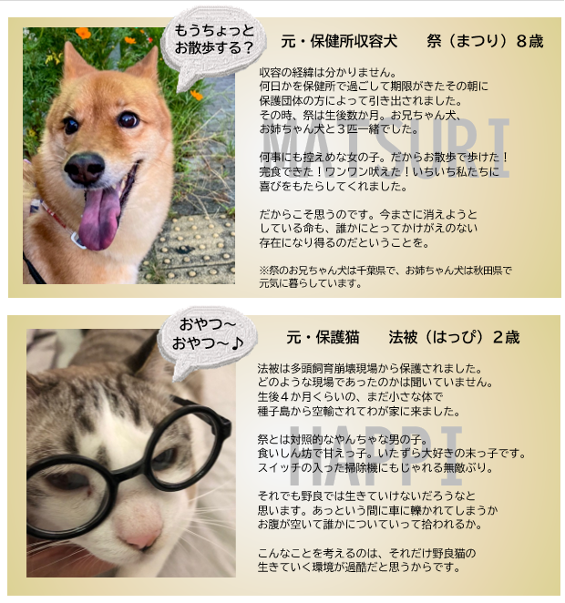 現在、元保護犬の祭(まつり)と元保護猫の法被(はっぴ)と奥様と一緒に暮らしています。彼らとの毎日は少し大変で、とっても幸せです。
