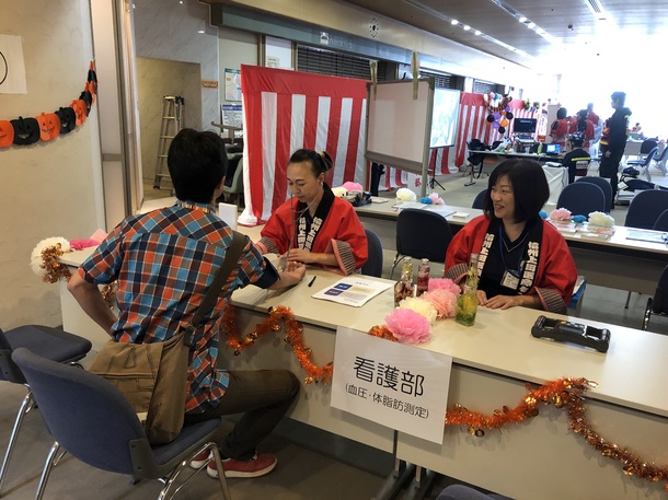 9月28日(土)は秋の晴天に恵まれ心地よい風が流れる中、近隣地域の皆さま約300人が病院祭においでいただき、血圧・体脂肪・血糖・骨密度測定のほか、お薬相談・栄養相談、体験コーナーとして『プチナース体験』・『手術体験』・『装具・車椅子・歩行補助具体験』等を実施しました。