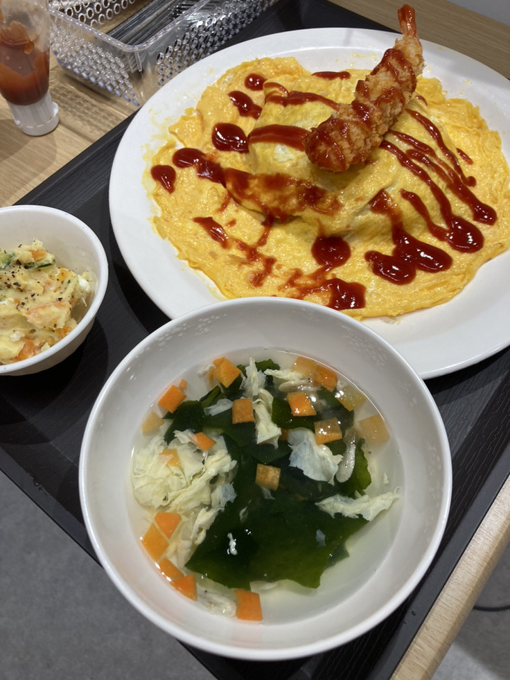 オムライスの卵やエビフライはご寄付としていただいた食材です。