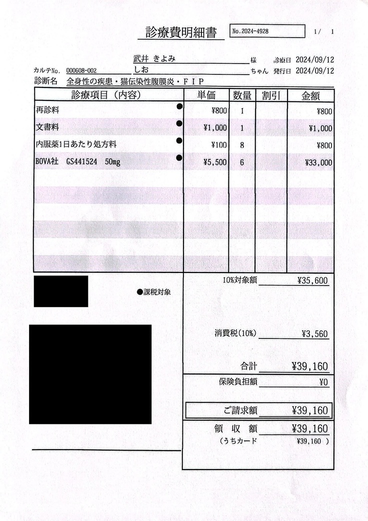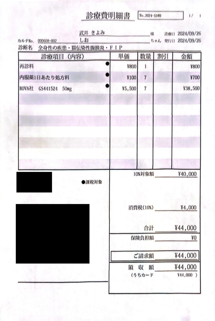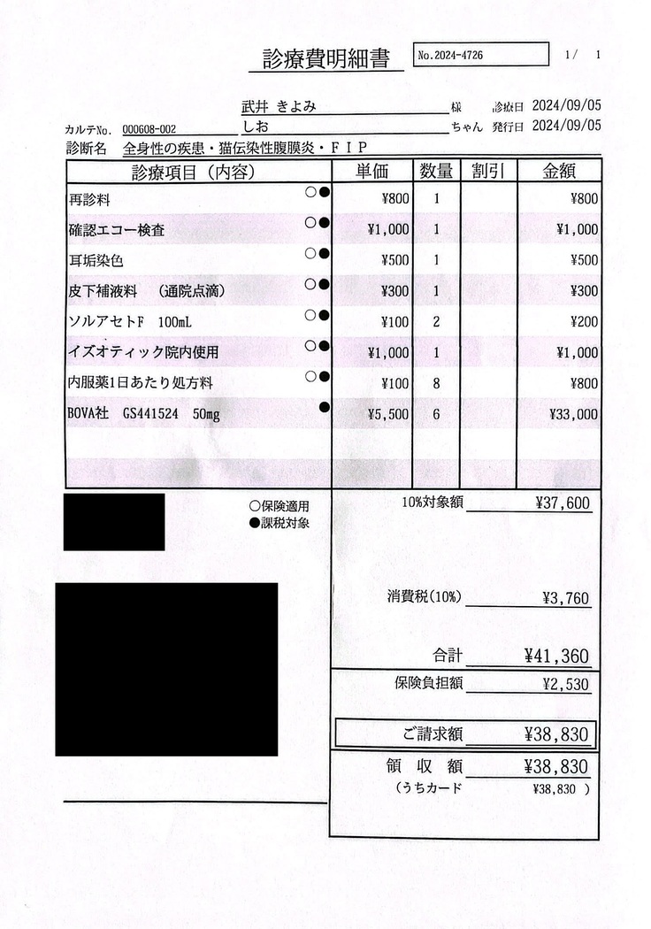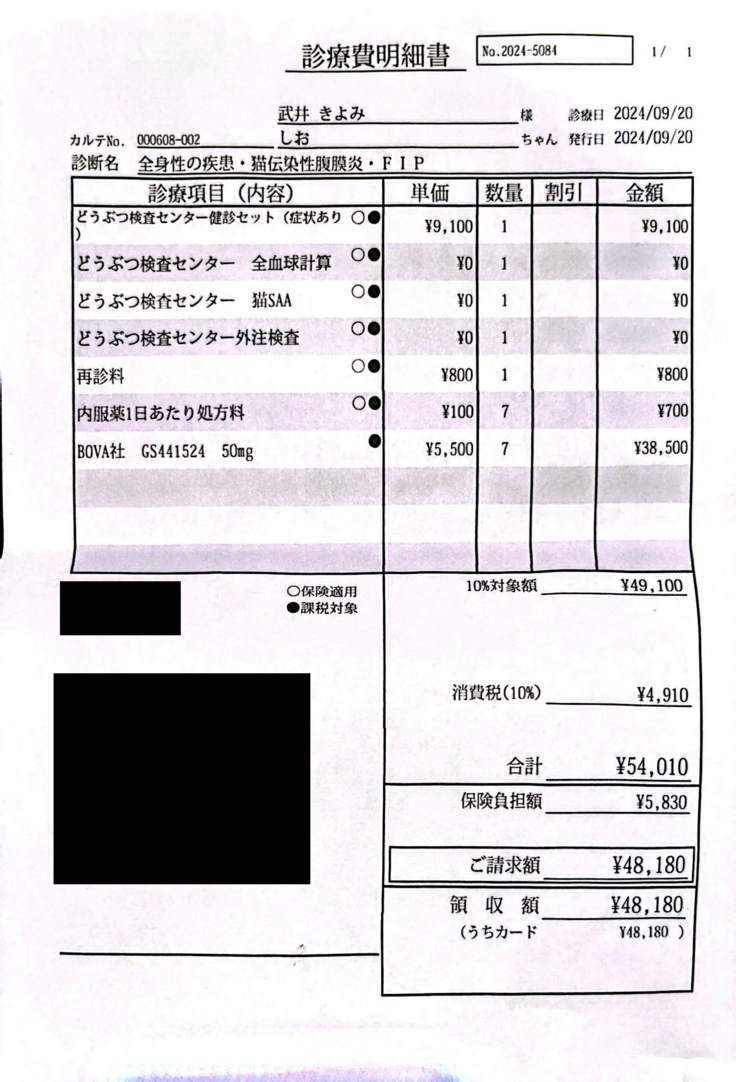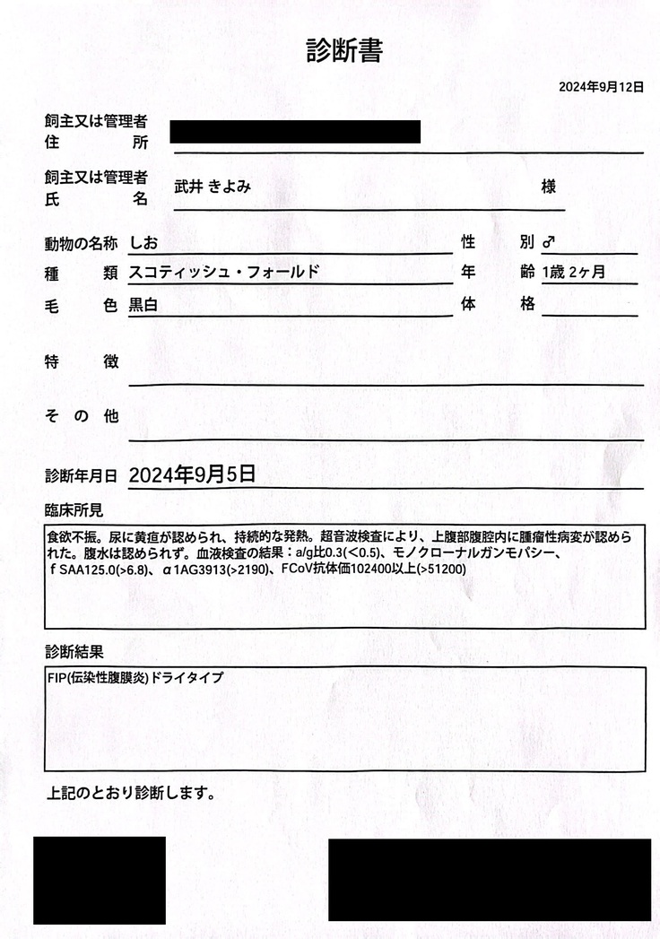 FIPの寛解を目指します。 ご支援いただきました皆さまの大切なお金は、全てしおの治療費に充てさせていただきます。