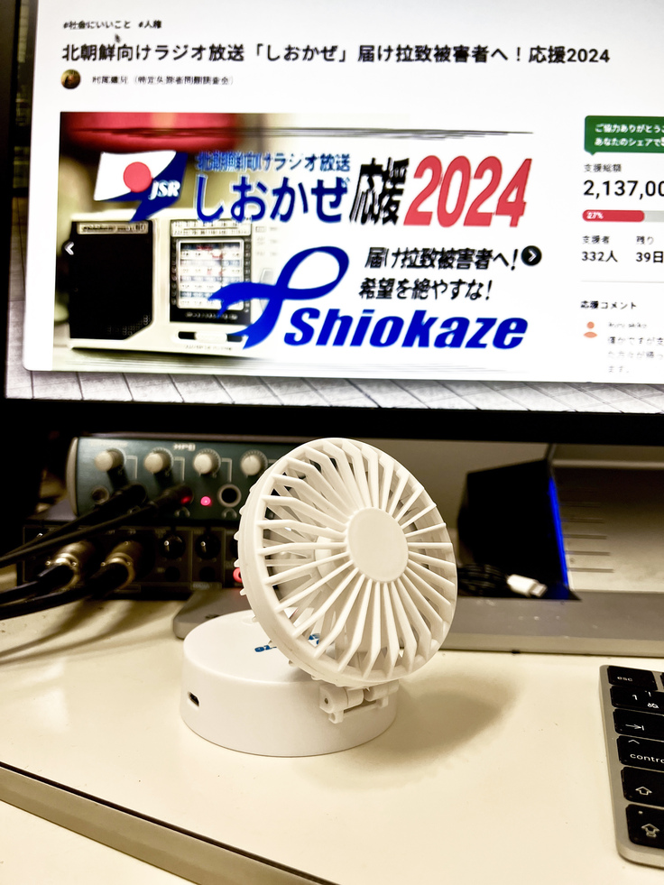 現在挑戦中の『北朝鮮向けラジオ放送「しおかぜ」届け拉致被害者へ!応援2024』クラウドファンディングのリターンに、しおかぜハンディファンが入荷しました!