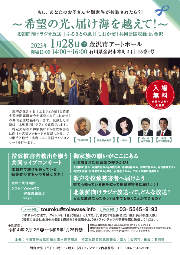 また、拉致被害者帰国を願うコンサートでは、地元合唱グループをお迎えし、会場に集まった皆さんと共に、北朝鮮で助けを待つすべての日本人へ音楽を通じて希望の光を届けて参ります。