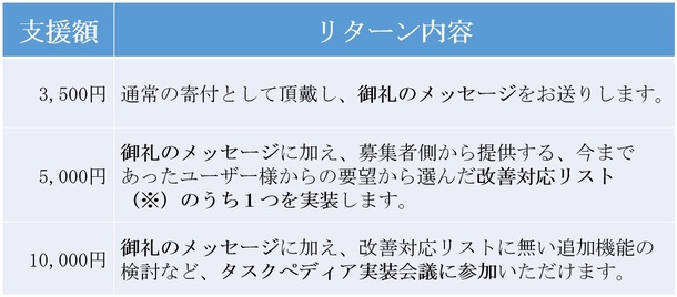 ※タスクペディアユーザーの方がご支援いただくときは、「自分が希望する機能を選べる」とお考えいただき、ユーザー以外の方がご支援いただくときは、「より有用な追加機能を実装させることで、タスクペディアの充実に貢献できる」とお考えください。