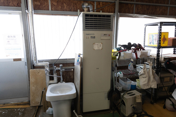 これまでは、この犬舎で生活する犬は年齢が若く、北海道犬などの寒さに強い犬が中心でしたので、当初から大型ストーブ1台で寒い冬を乗り越えてくることができていました。