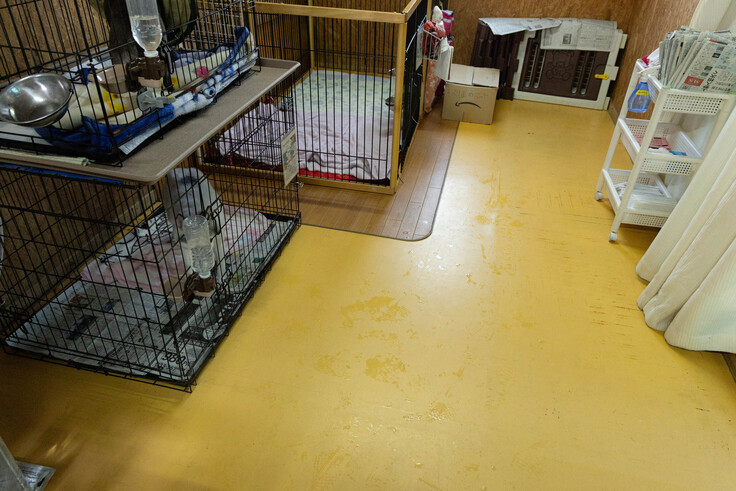 犬たちはケージやサークルで過ごしているため、フリースや毛布、ペットヒーターを敷いて寒さ対策はしていますが、底冷えが直接影響してしまいます。