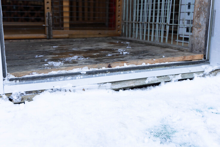 入口の下部の木が腐り朽ちていることもサッシが歪んだり、犬舎内の底冷えの原因となっているため修繕が必要と考えます。