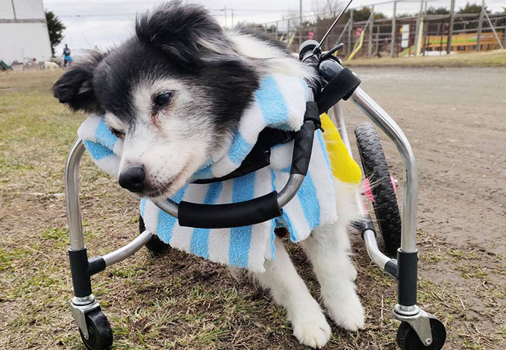 お家には、当会の卒業犬の元気満開な完くんもいますが、お忙しい中なのに笑顔で楽しくスモーキーの介護をしてくださっています。