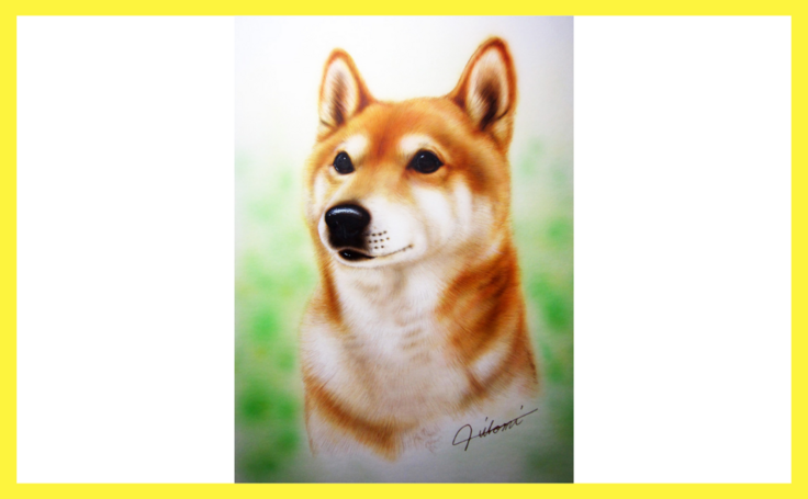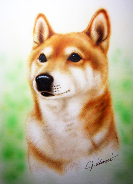 ペットの肖像画は、エアブラシを使用し筆で仕上げた動物画です。背景はエアブラシで淡く色を入れますが、その子のイメージカラー等のお色のご希望があれば承ります。肖像画は、動物でしたら種類は問いません。1点につき1頭までお写真そのままで制作します。