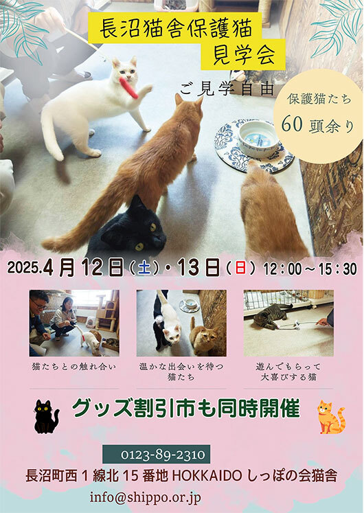 明日・明後日 4/12(土)・13(日) 長沼猫舎保護猫見学会とグッズ割引市開催