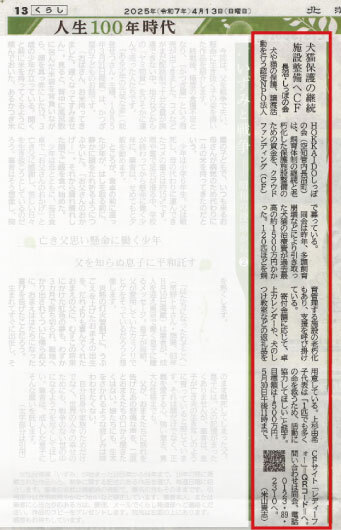 4/13 北海道新聞くらし面に しっぽの会クラウドファンディングの記事をご掲載くださいました