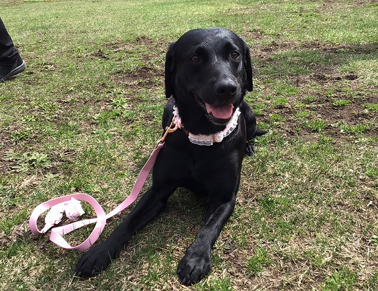 ピンクのかわいいフリフリの首輪とリードで、しっかり先生のお手伝いをしてくれました。