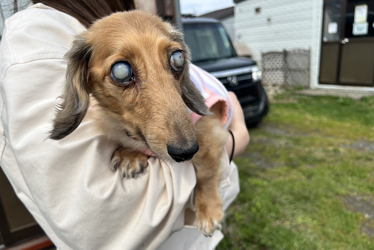 スピカちゃん(旧:クッキー)は、昨年2024年2月に千歳市内の元ブリーダーの多頭飼育放棄案件で引き取りした8~10歳のミニチュアダックスの女の子です。
