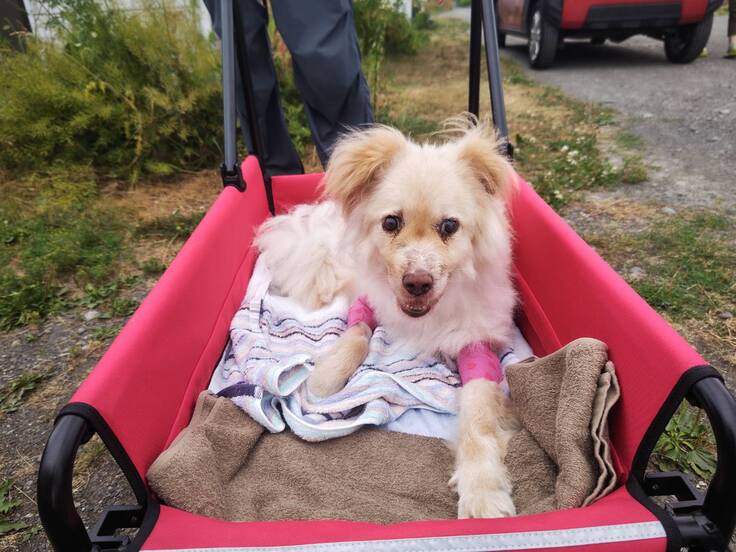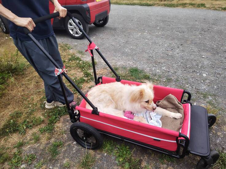 そして、夕方にはカートに乗ってのお散歩――コロッケにとって、きっと外の空気や風の匂い、スタッフとの時間が何よりの生きる活力になったと思います。