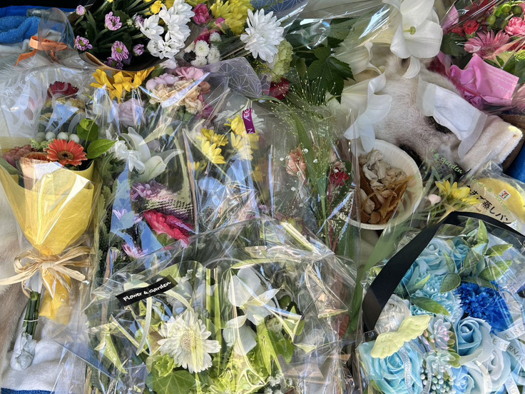 亡くなった翌日は日曜日でしたので、クリープが保護されてからずっと見守ってくれていた日曜日のボランティアさんが会いに来てくださり、たくさんのお花を頂きました。