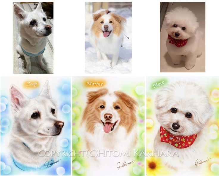 ご支援者さま3名の愛犬たちを描いていただきましたが、どの子もまるでそこにいるかのような生き生きとした表情で、空気感まで伝わってくるような素晴らしい作品となりました。