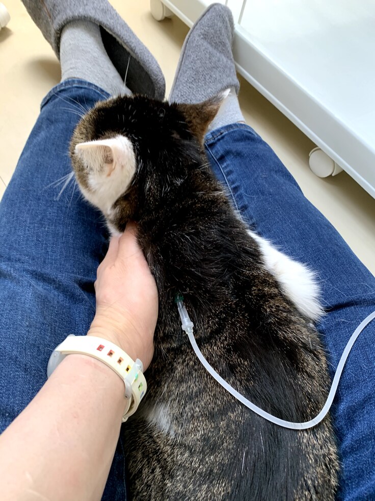 【慢性腎不全で皮下輸液の様子】毎日輸液中は付きっきりでのケアが必要になります。