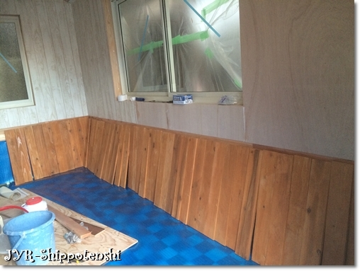 天井の壁紙貼りと 腰壁を打ち付ける作業は