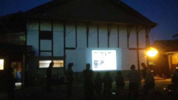 また3月21日には、ご支援いただいた近隣の皆様にお集まりいただき、完成パーティーも開催させていただき、お座敷では商店街で計り売りしているお茶と地元人気の「津多屋の本わらび餅」、見世では地元のお魚屋さん「布安」のオードブルと原酒「るりの誉れ」、寒空の下でしたが、白壁への投影も試してみることができました。「殿様支援」の皆様のお名前を刻印した銘板も白壁に取り付けさせていただきました。
