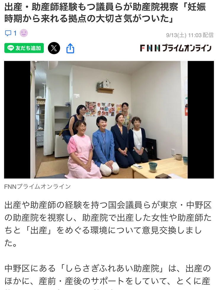 出産や助産師の経験を持つ国会議員らが東京・中野区の助産院を視察し、助産院で出産した女性や助産師たちと「出産」をめぐる環境について意見交換しました。