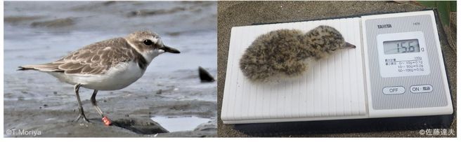 左:赤い足環がついているシロチドリ。足環を取り付けた場所と異なる所でその足環が確認されれば、シロチドリが移動したことがわかります。(捕獲調査は許可を受け実施しています)