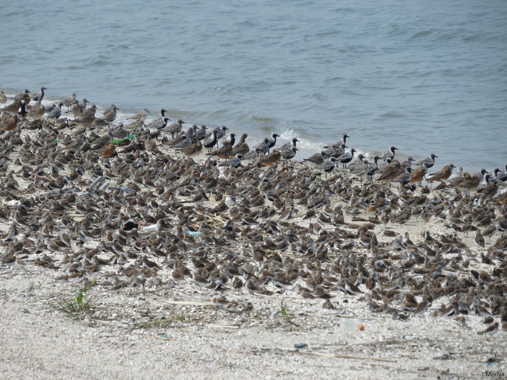 ▲毎年砂浜に渡ってくる沢山のシギ・チドリたち。