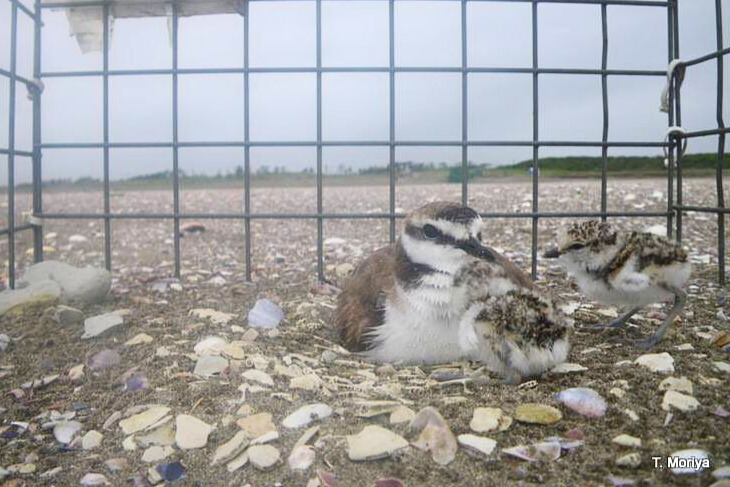 シロチドリは巣に人が近づくと警戒声を出したり親が飛び立ったり、擬傷(ぎしょう)します。