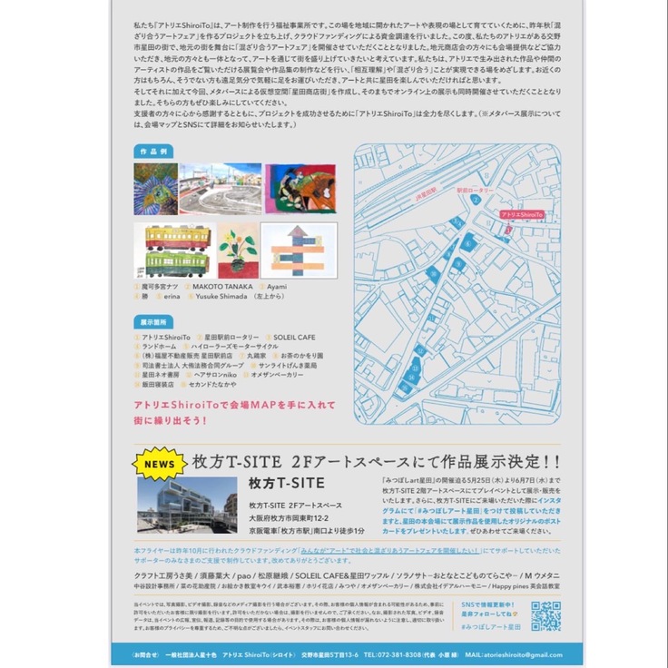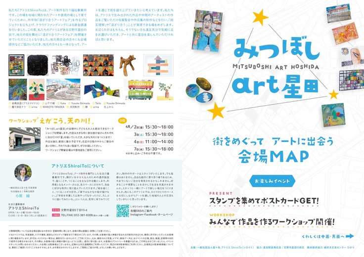 上記に加えて星田駅前ロータリーでの子どもから大人が参加した共同制作や、アトリエシロイト内での展示やポストカードの販売や原画展示もあります。