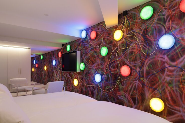 アーティスト選定にあたり大切にしたのは、 ローカルとグローバルをつなぎ、歴史と未来をつなぐ白井屋ホテルらしいワクワク感と、コロナ禍の閉塞感を吹き飛ばすポジティブなパワーです。もともと白井屋ホテルの客室のために手がけたアート作品が、宿泊客、特にお子様に非常に人気が高かったことも我々を後押ししました。