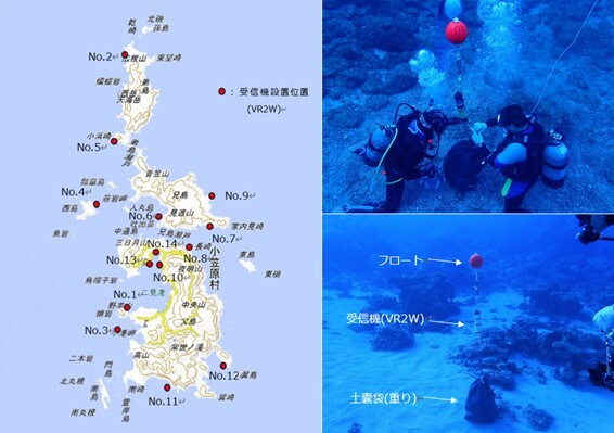 2020年シロワニ2個体の調査結果である「夏は父島の二見湾内から姿を消すこと」「夏は水深70~120mに滞在していたこと」をもとに、2024年8月29日から9月7日までの7日間、漁船の上から受信機を用いて、音波発信機を装着したシロワニを捜索しました。