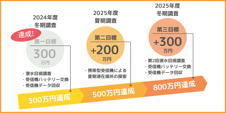 さらにもう300万円まで集まることが叶えば、2025年度の冬期調査で第2回目の潜水目視調査と超音波受信機のバッテリー交換を進めることができ、2年間の調査により、より精度の高い「小笠原群島におけるシロワニの生息数推定値と周年回遊生態」という成果を得られることが期待できます。