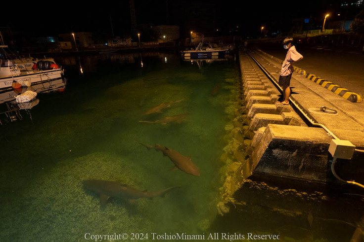 そんな島時間がゆったり流れるところに、ジョーズの音を響かせて強面のシロワニが、水深2メートルほどの桟橋の付け根に現れます。